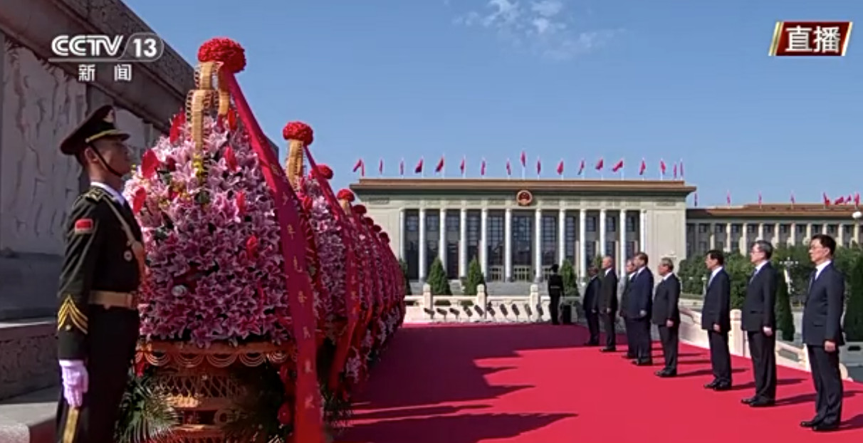 9月30日烈士纪念日,党和国家领导人同各界代表向人民英雄敬献花篮。庄严的天安门广场上,鲜艳的五星红旗高高飘扬,人民英雄纪念碑巍然矗立。广场中央,“祝福祖国”巨型花篮表达着对祖国繁荣昌盛的美好祝愿。纪念碑北侧,两组花坛上白菊等鲜花组成的18个花环,寄托着全体中华儿女对英烈的深情追思。