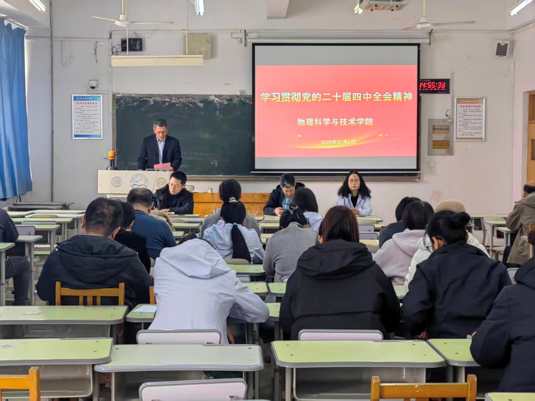 2025年11月6日下午,物理科学与技术学院召开专题学习会,集中学习贯彻党的二十届四中全会精神。学院领导班子、全体教职工参加了会议。