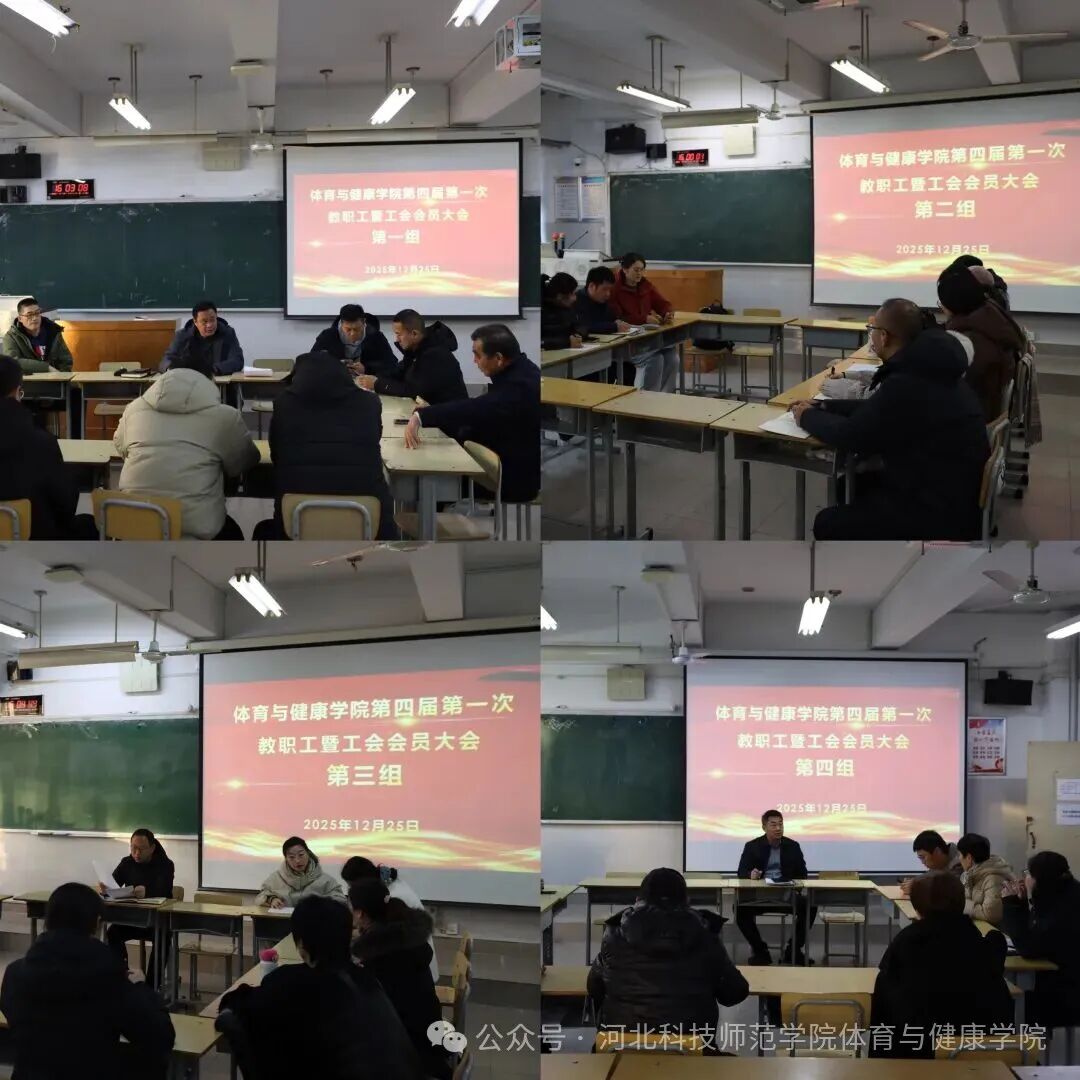 体育与健康学院第四届第一次教职工暨工会会员大会于2025年12月25日下午顺利召开。会议由学院党委副书记、工会副主席王海军同志主持,学院全体教职工参加了会议。党委书记、工会主席张旭尧,院长杨洪涛、副院长赵华恩,党委委员、纪检委员张献辉等出席会议。