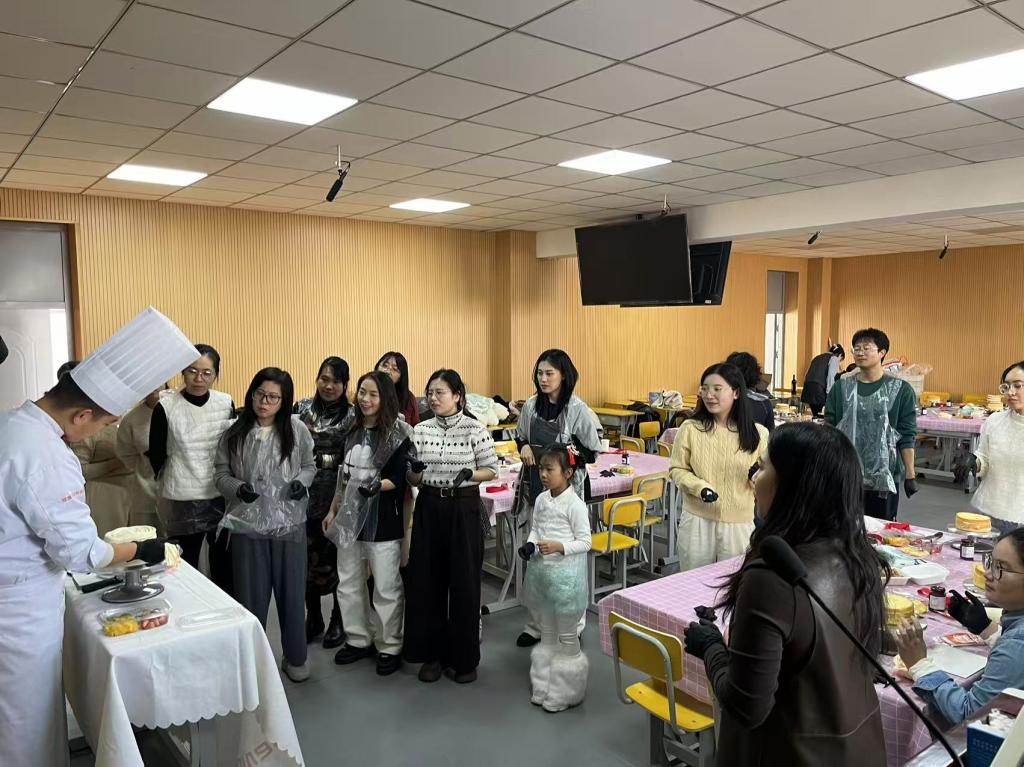活动伊始,专业烘焙老师为大家详细讲解了蛋糕制作的基础知识、食材配比、裱花技巧及创意装饰方法。在轻松愉快的氛围中,老师们暂时告别繁忙的教学科研工作,系上围裙,化身“烘焙达人”,全身心投入到创作过程中。大家充分发挥想象力与协作精神,从蛋糕胚的涂抹、奶油的雕琢到水果的装点,每一步都精心操作,彼此交流心得,互相帮助,现场欢声笑语不断,其乐融融。