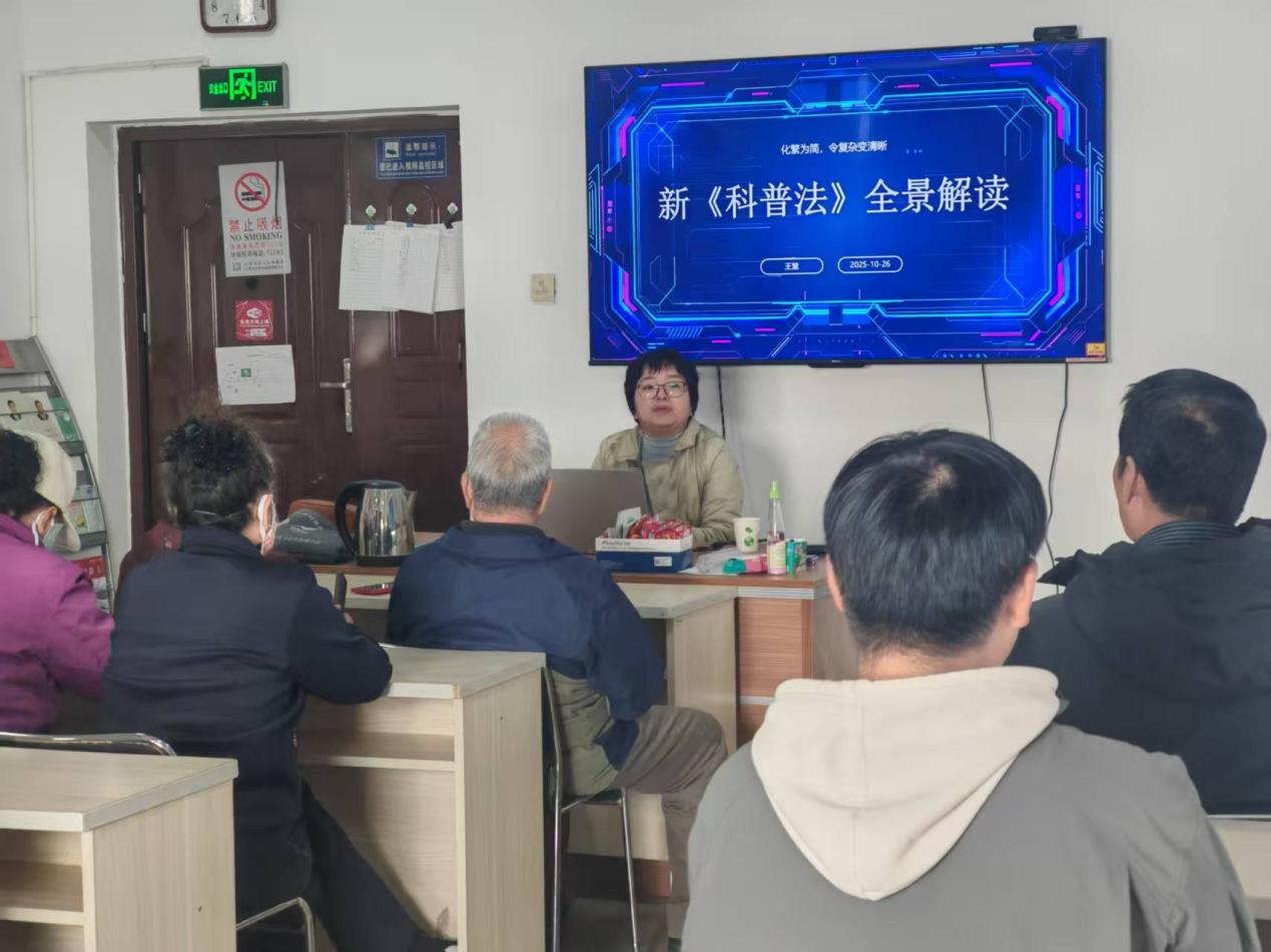 宣讲团队由赵福江教授、王慧副教授及团队成员逯雯涛等组成,先后走进金龙花苑社区、车站社区、自然家园社区、燕大西苑社区和服远社区,开展题为《新科普法全景解读》的系列宣讲,累计吸引社区居民300余人参与。宣讲中,专家们以幽默风趣的语言开场,用贴近生活的案例解析法律条文,将原本抽象的法条转化为通俗易懂的“身边事”,帮助居民轻松理解新科普法的核心内容与现实意义。不同年龄层的居民专注聆听,积极互动,现场气氛热烈。