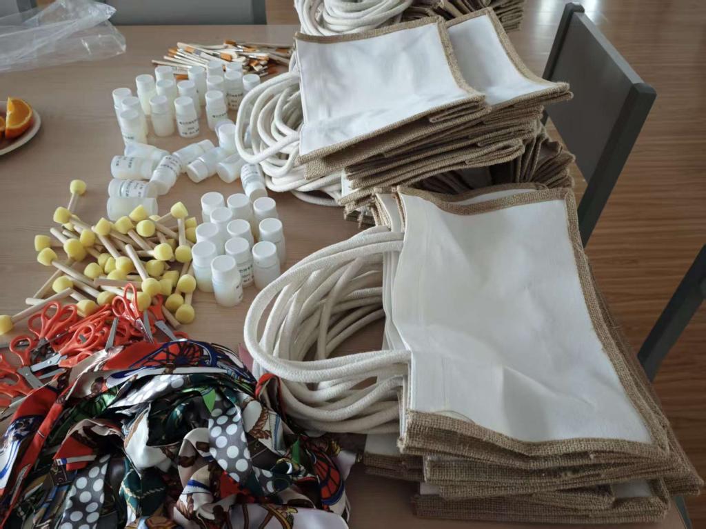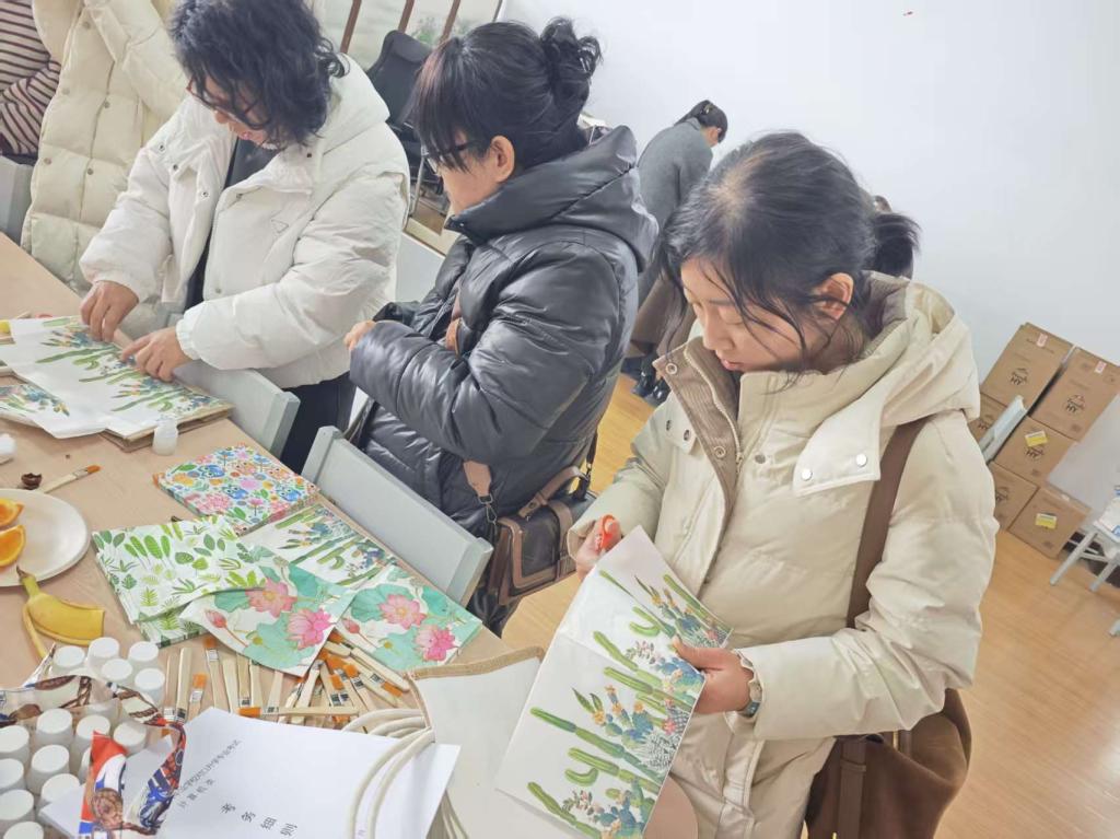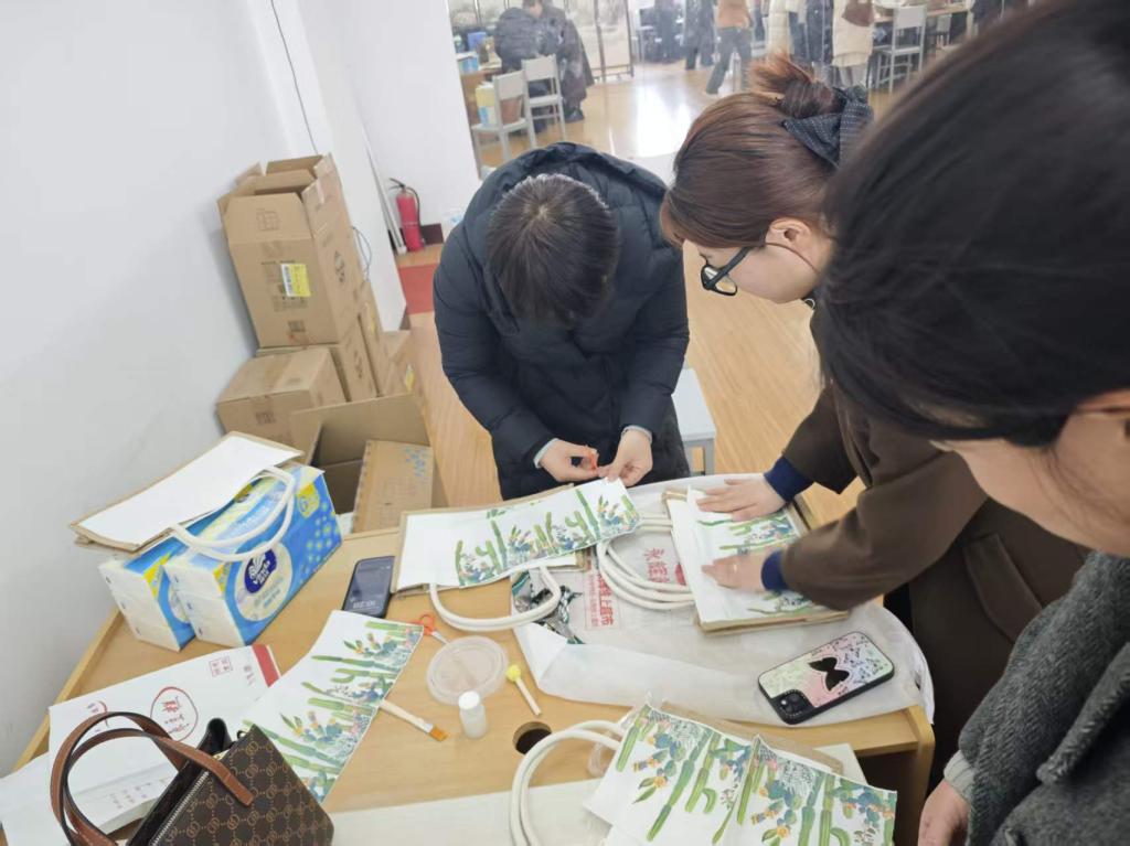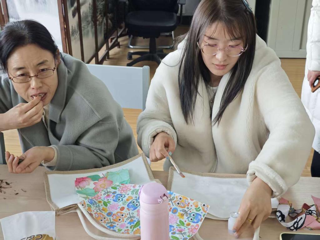 活动现场暖意融融,琳琅满目的手工材料整齐摆放:质朴的麻布包身、柔软的棉绳提手、色彩丰富的印花布料、精致的装饰丝巾,还有画笔、胶水等工具一应俱全。老师们围坐在一起,一边交流工作与生活的趣事,一边发挥巧思,动手创作属于自己的专属包包。