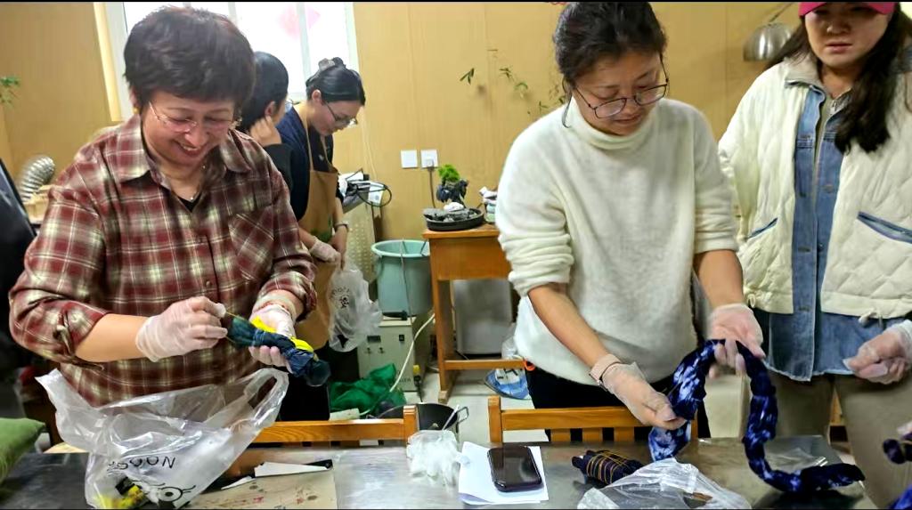 本次活动特邀学院扎染/蜡染非遗传承实践者贾辉老师亲临现场授课指导,带领全体女教职工沉浸式制作扎染抱枕,近距离感受传统扎染技艺的独特魅力。贾辉老师深耕非遗传承与教学领域多年,长期带领学生开展扎染创作与非遗推广工作,曾带队参与央视《大美秦皇岛》节目拍摄,全力助力地方文旅发展与非遗文化传播,有着丰富的教学实践与非遗推广经验。