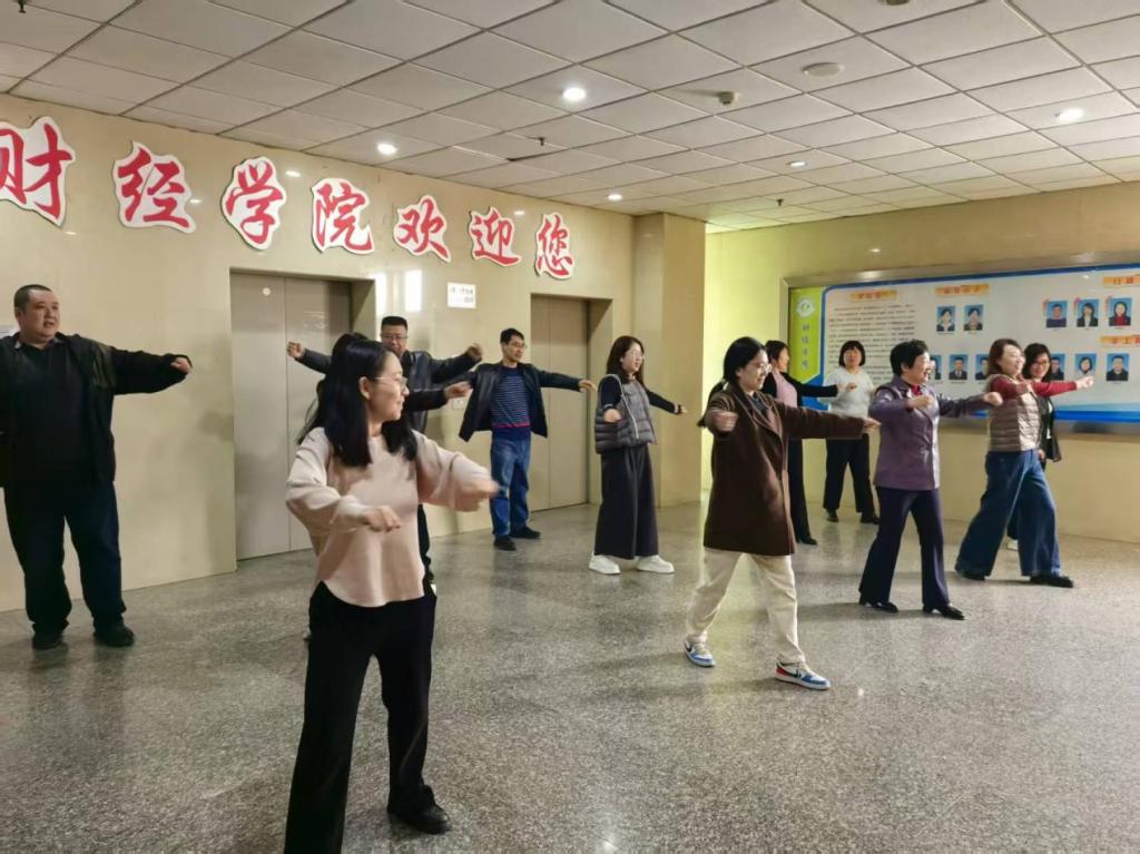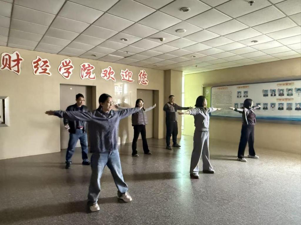 活动现场,伴随着舒缓明快的音乐,老师们利用工作之余的大课间,在学院大厅整齐列队。大家精神饱满、热情高涨,跟随节奏伸展肢体,从扩胸、转腰到压腿每一个动作都标准规范,展现出昂扬向上的精神风貌。